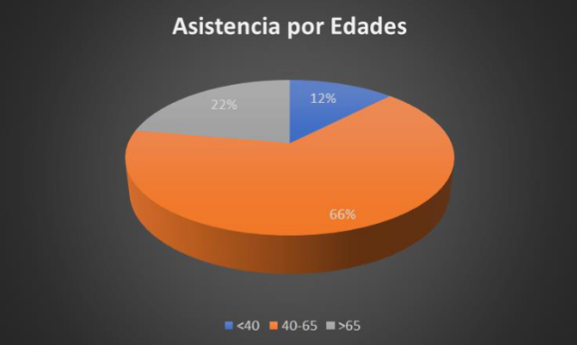 Por edades, la asistencia mayoritaria se concentra en los vecinos de entre 40 y 65 años destacando también los interesados mayores de 65 y en menor medida los que edades menos de 40 años.