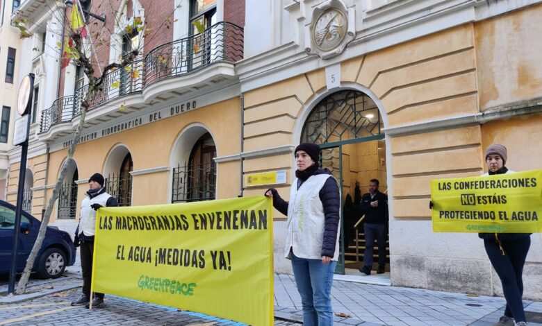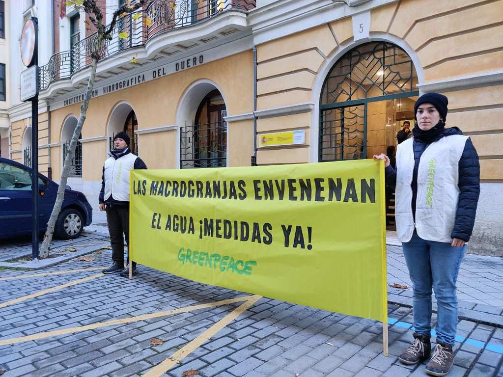 Activistas de Greenpeace, en las llaves de paso del organismo de cuenca en Valladolid, portan pancartas con mensajes como “Agua cortada por mala gestión”, “Las confederaciones no estáis protegiendo el agua” y, en las puertas principales,“¡Las macrogranjas envenenan el agua! ¡Medidas YA!”