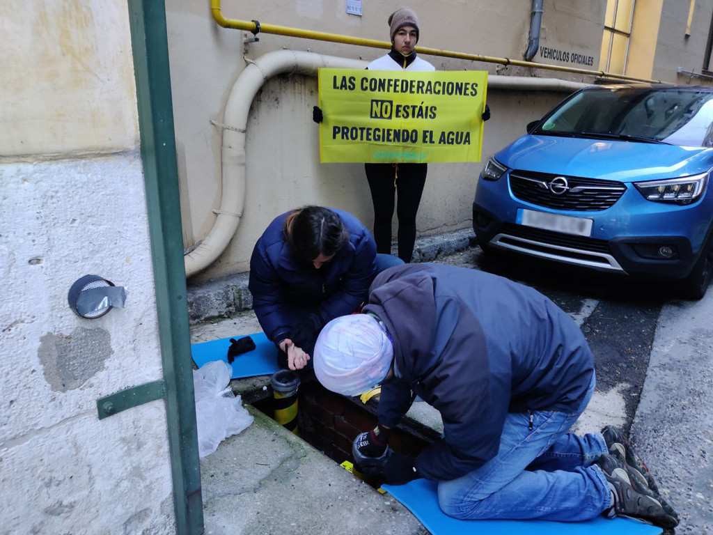 Las personas activistas inmovilizadas en las llaves de paso portaban pancartas en las que se podía leer mensajes como “Agua cortada por mala gestión”, “Las confederaciones no estáis protegiendo el agua” y, en las puertas principales,“¡Las macrogranjas envenenan el agua! ¡Medidas YA!”.