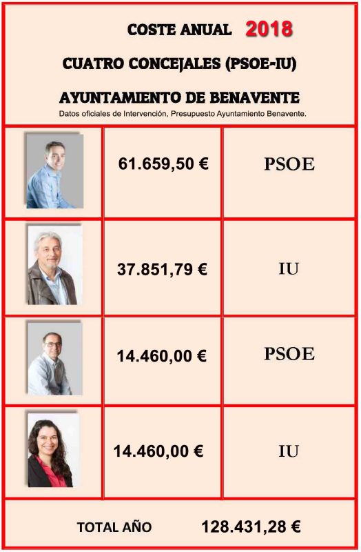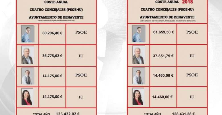 El coste anual de los concejales liberados, dos de IU y uno del PSOE, más el alcalde, supondrá en el 2018 para el Ayuntamiento de Benavente 128.431,28 euros, 3.009 euros más que en el año 2017. Éstos son los datos que se reflejan en los presupuestos del próximo año relativos a los órganos de gobierno.