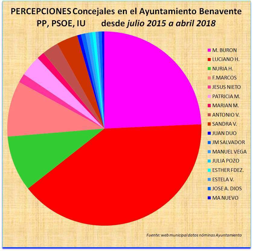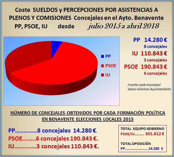 Las percepciones en concepto de sueldos y dietas por asistencias a comisiones y Pleno de los miembros del Equipo de Gobierno PSOE/IU, en lo que va de mandato (datos de julio 2015 a abril 2018) ascienden a 301.612 €; de los cuales 190.843 € corresponden a los seis concejales del PSOE y 110.843 € a los tres concejales de IU.