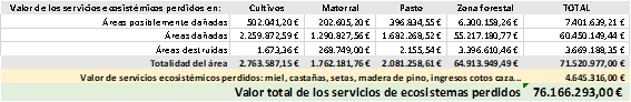 Tras el incendio de la Sierra de la Culebra, desde la Coordinadora Rural Zamora y la Facultad de Ciencias Agrarias y Ambientales de la Universidad de Salamanca se tomó la determinación de realizar un estudio inicial para cuantificar económicamente los daños ocasionados por el incendio. Una valoración global, que incluyera tanto las pérdidas de producción en los diferentes sectores económicos vinculados al medio natural como los servicios de ecosistema de provisión, regulación y culturales. Una visión amplia que contribuyera a marcar la dimensión real del impacto del incendio. Los datos que se arrojan en este estudio son los siguientes: