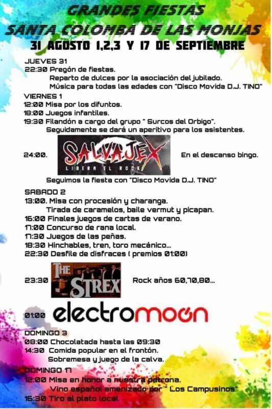 Un abanico de actos se extiende desde este 31 de agosto hasta el domingo 3 de septiembre, ampliándose también al domingo 17 de septiembre, la jornada festiva dedicada a la patrona Santa Colomba. Juegos, concursos, atracciones infantiles, desfiles de disfraces, actuaciones musicales, verbenas y celebraciones religiosas vienen de la mano en este programa festivo.