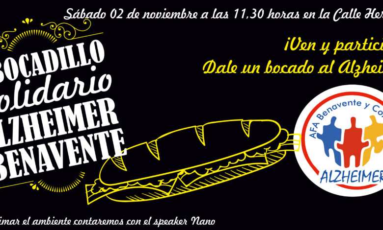 La Asociación de Alzheimer de Benavente y Comarca organiza un año más el V bocadillo solidario bajo el lema “Dale un bocado al Alzheimer”. La Calle Herreros volverá a albergar el 2 de noviembre a las 11:30 de la mañana una actividad solidaria en la que siempre participa gran cantidad de gente.