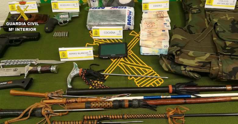 munición, dos pistolas de aire comprimido, varias armas blancas (un puñal, un hacha, navajas y varios bastones estoques catalogados como armas prohibidas), un chaleco antibalas, 7.000 Euros en efectivo y otros efectos, así como dos vehículos utilizados para la comisión de los hechos delictivos.