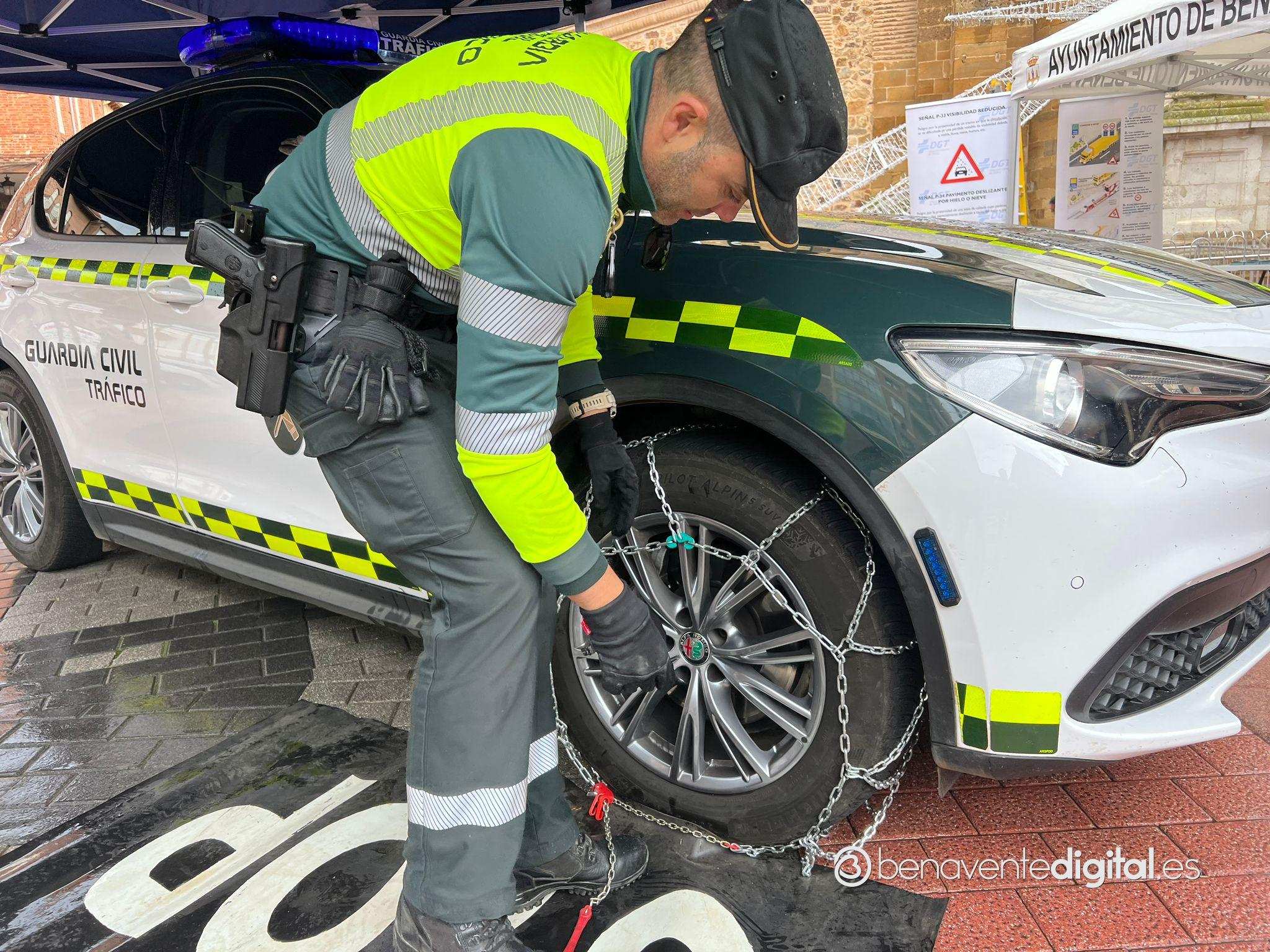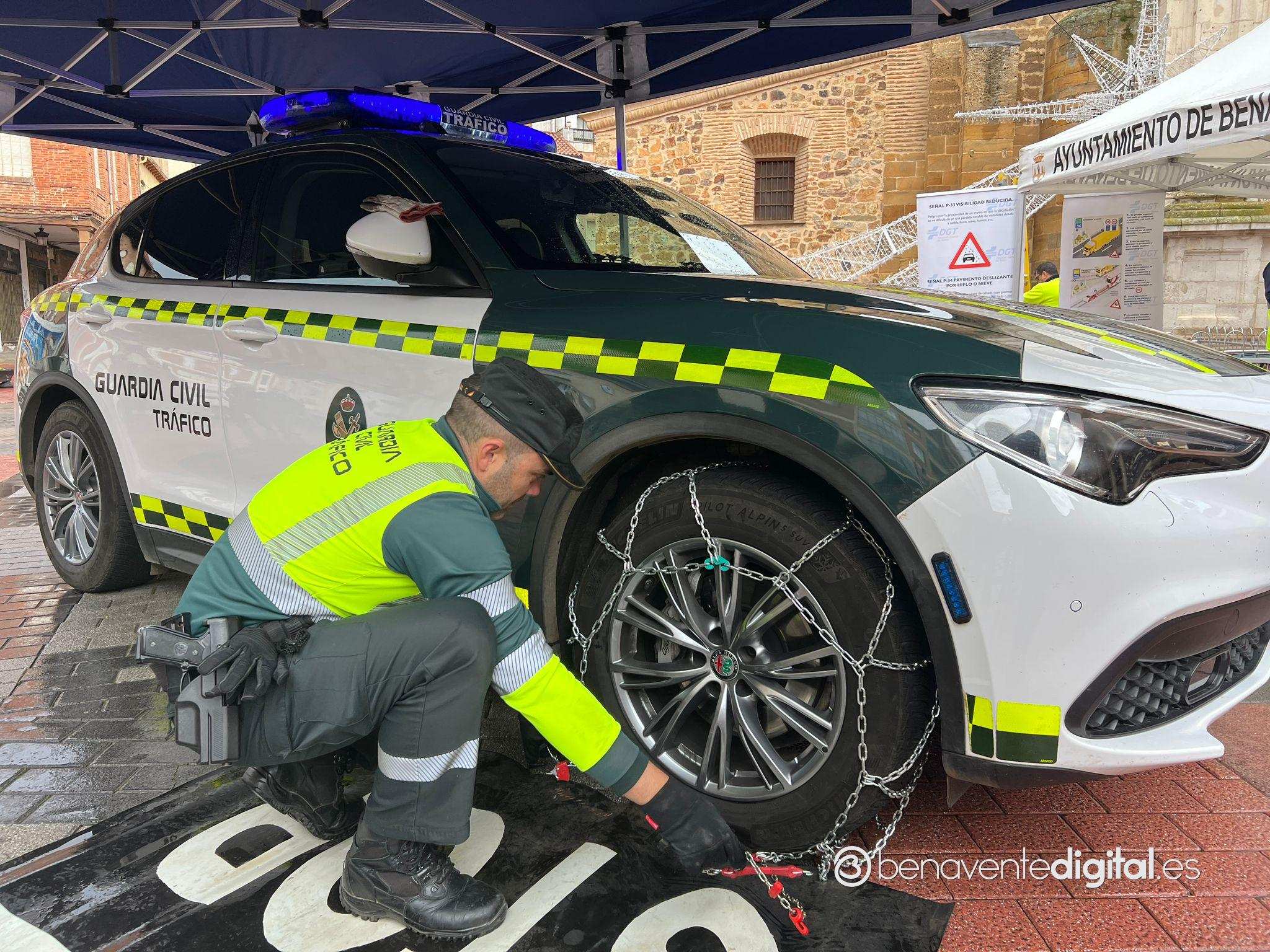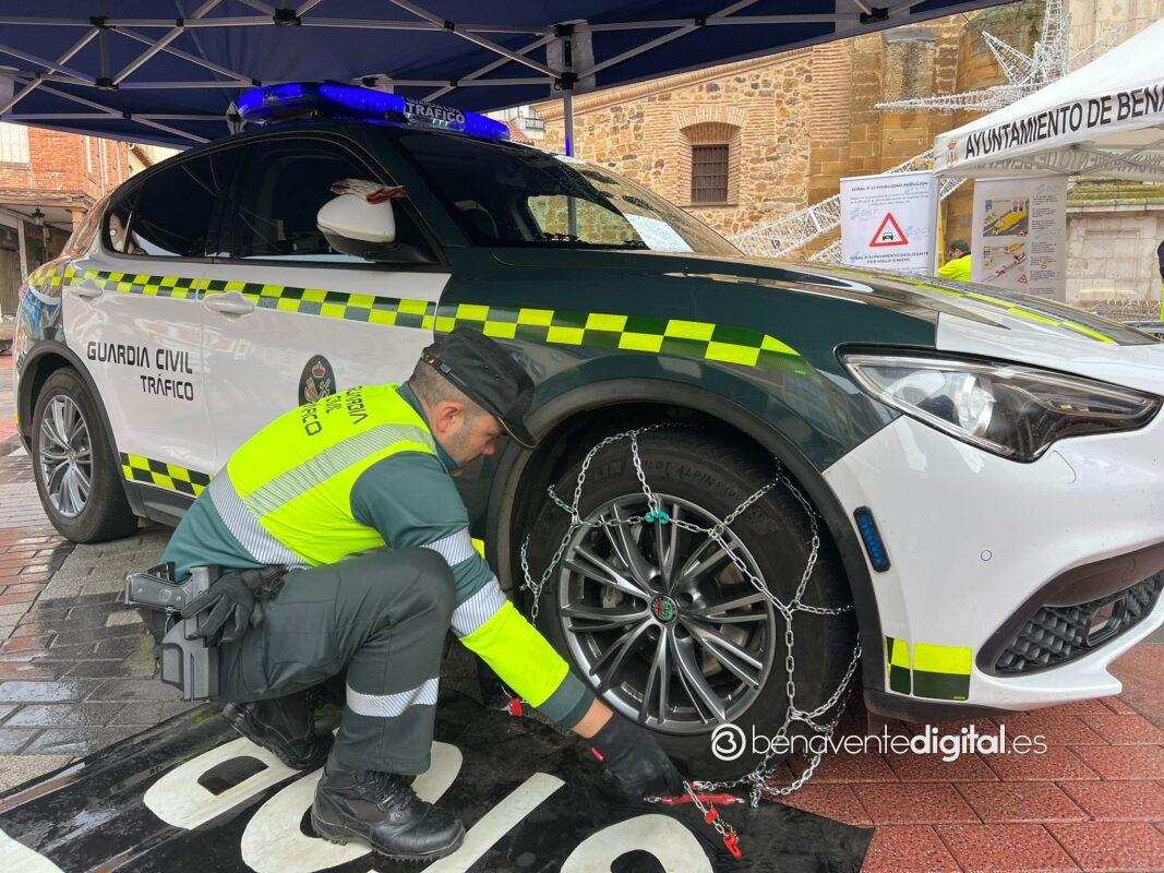 Agentes de la Guardia Civil de Benavente han impartido esta mañana, desde las diez y media en la plaza de la Madera, un taller formativo de colocación de cadenas en las ruedas de los vehículos ante la llegada del tiempo invernal.