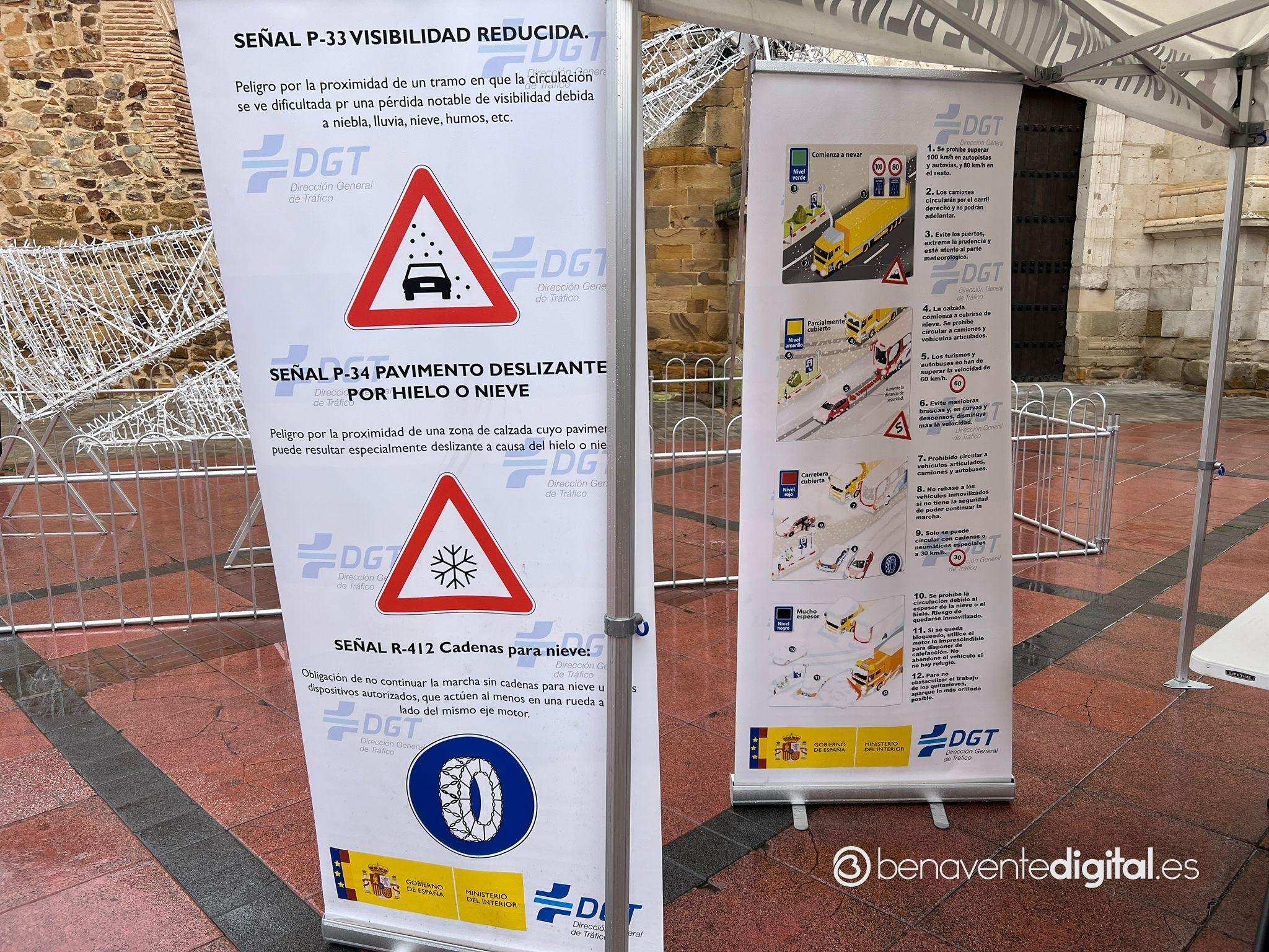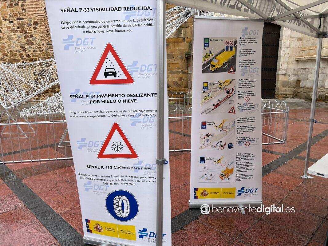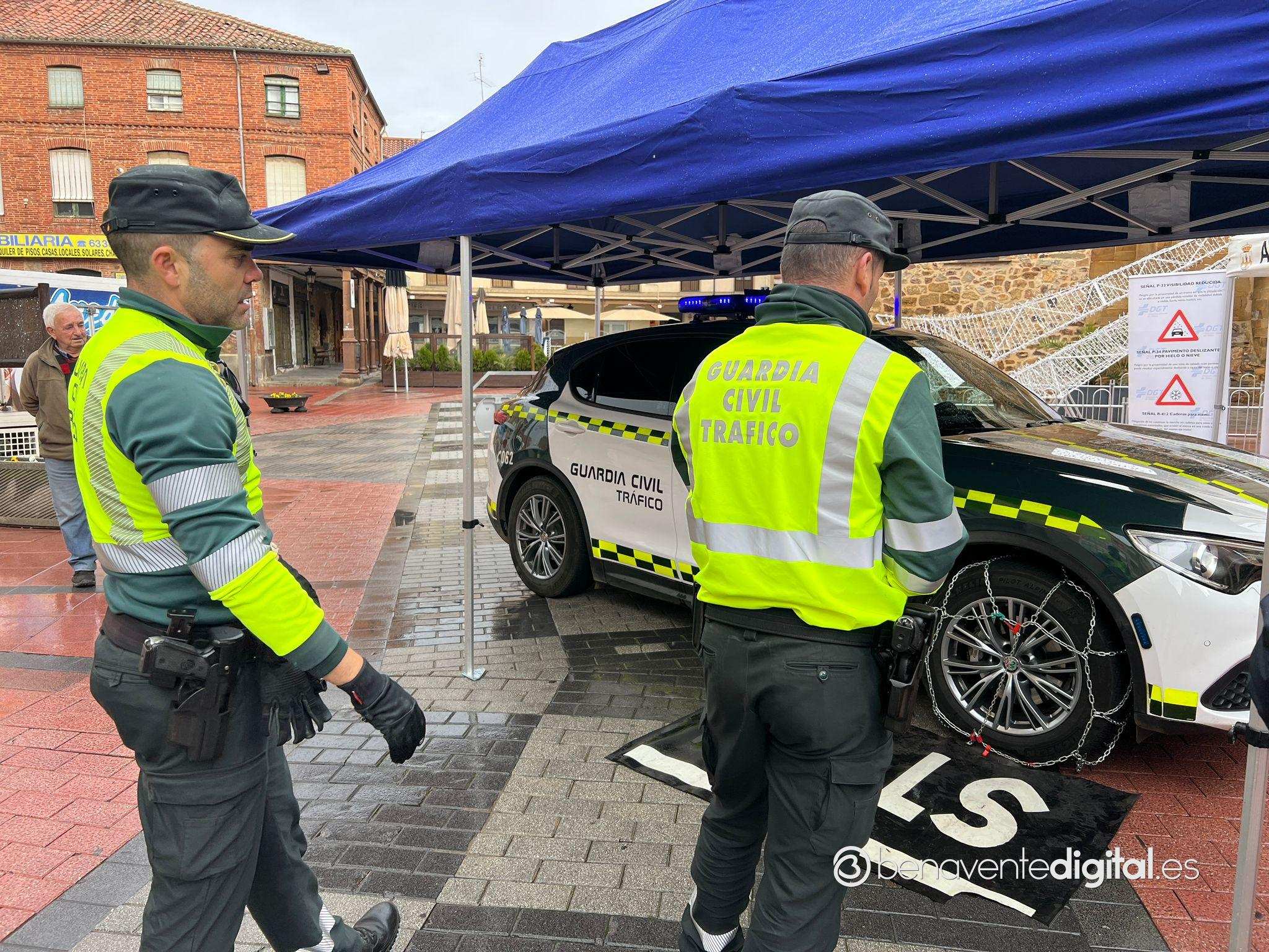 Agentes de la Guardia Civil de Benavente han impartido esta mañana, desde las diez y media en la plaza de la Madera, un taller formativo de colocación de cadenas en las ruedas de los vehículos ante la llegada del tiempo invernal.