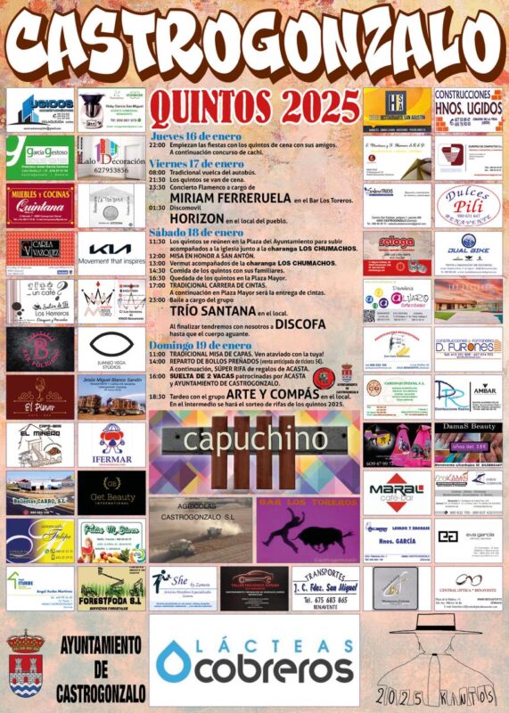 El grupo de quintos y quintas de este año en Castrogonzalo abre sus fiestas y en honor a San Antón el próximo jueves 16 de enero. El abanico de actos extiende sus tablas el jueves y se pliega el domingo 19 de enero.