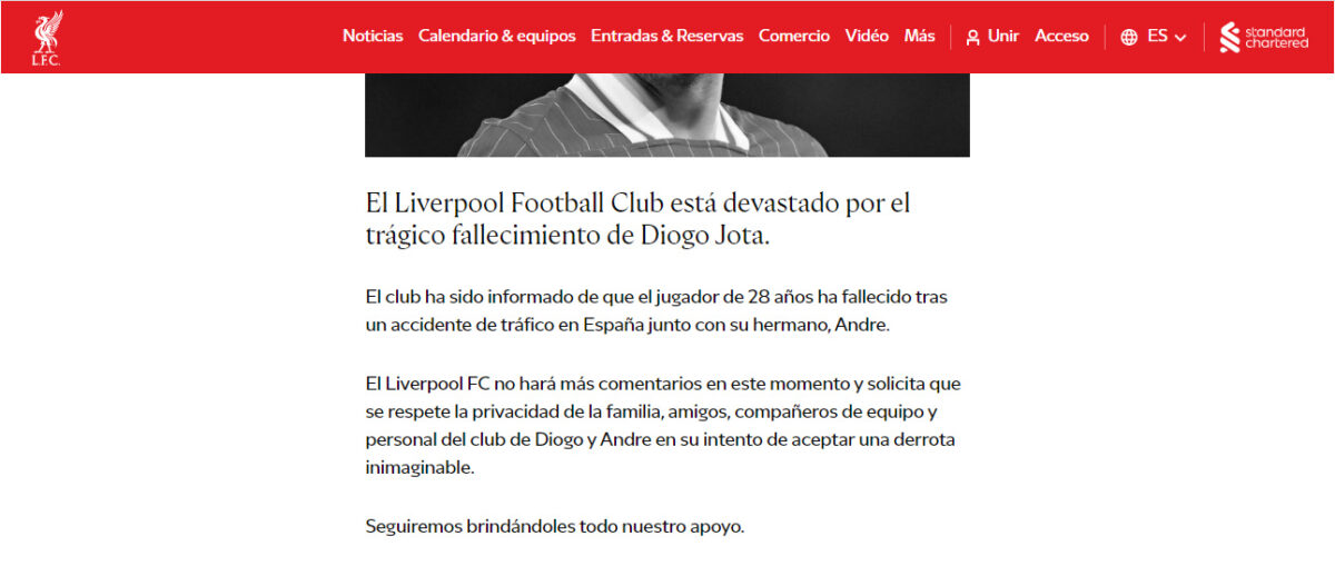 Las pruebas de condolencia se van sucediendo entre las que destacan las de su club el Liverpool F.C o el capitán de la selección portuguesa Cristiano Ronaldo.