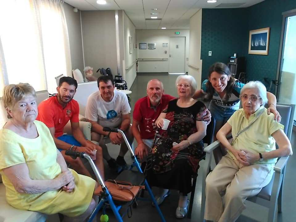 Pero no todo iba a ser malo. Ya hemos dicho la extraordinaria acogida que hemos tenido en todos los centros de Domus Vi en los que hemos parado. Pues bien, lo de hoy en la Residence Le Grand Chai, 13-15, Avenue des Bains de Balaruc-le-Vieux, no tiene nombre. Ha sido lo más extraordinario que se pueda imaginar. Al llegar nos tenían la comida preparada en el comedor con todos los residentes. Nos han enseñado donde dormir, donde ducharnos y nos han dejado una habitación para descansar durante el día. La comida magnífica, la cena de lujo, y repitiendo, y durante la tarde nos han dado una deliciosa merienda a base de bizcocho y refrescos. Además, por fin hemos tenido oportunidad de interactuar con un grupo de abuelitas que hablan o hablaban español. Ha sido un rato mágico con Madame Regina, Madame Monique y Madame Juanita. Regina se ha emocionado un montón al tener la oportunidad de recordar el idioma de su padre; Monique se ha arrancado a cantar «Tengo una muñeca vestida de azul…» recordando su niñez; y Juanita nos ha dicho que no le parecía serio que cantáramos la Marsellesa sin tener un buen motivo. Todas ellas saben ya situar a Vigo en el mapamundi. En definitiva, una bonita tarde.