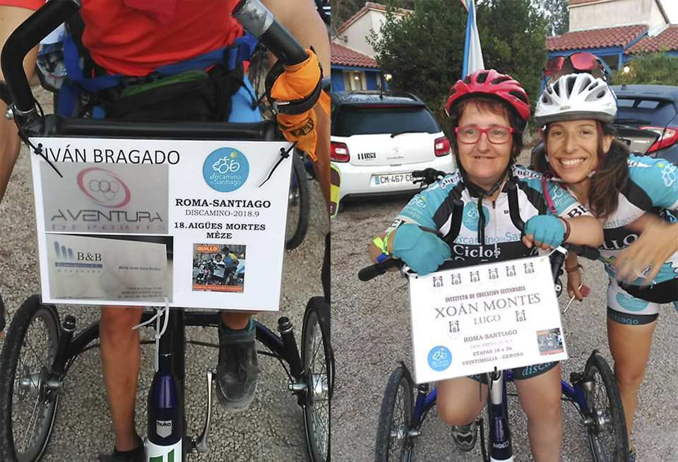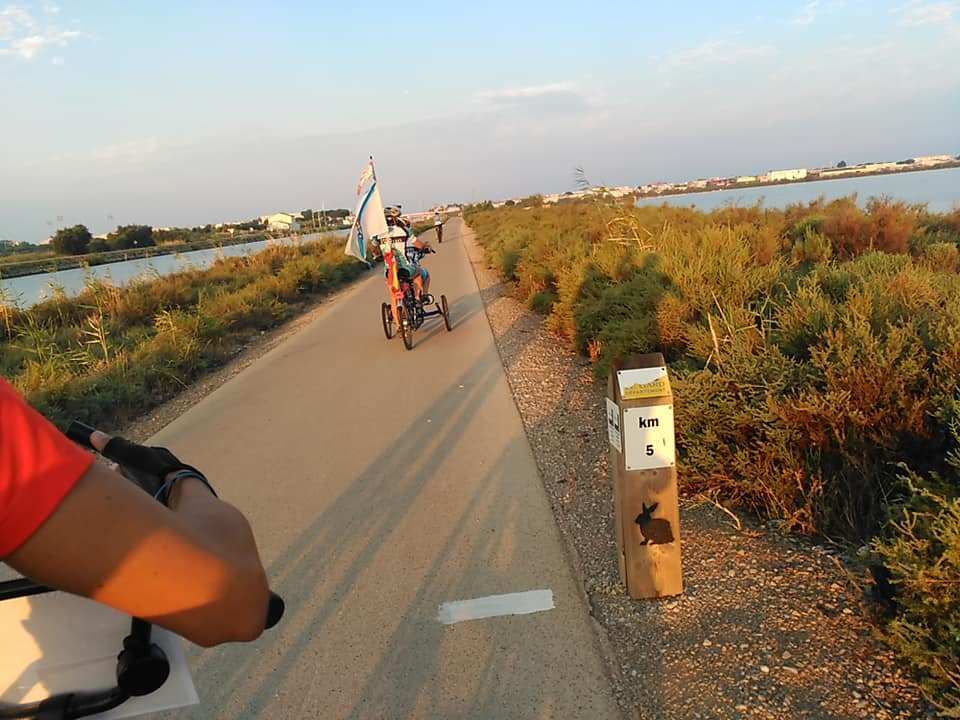 Alrededor de las 6:30 de la mañana, después de recoger todo y cargarlo en la furgoneta, colocarle a los triciclos en los manillares los patrocinadores del día, calzar las zapatillas de pedalear, llenar los botes de agua, repasar el aire de las ruedas de las bicis, meter la silla de Iván en la furgoneta, hacer las fotos de los carteles y de la pancarta de Iván, colocar en la funda del móvil el papel con la ruta, colgar la funda del móvil en el manillar del triciclo, ajustar los cascos y viseras, encontrar un precioso tanga olvidado debajo de una cama del cuarto de las chicas, devolverle el tanga a su dueña, apretar las tuercas del sillín de Paula, apretarle las tuercas a Paula, subir a Iván al triciclo y despedirnos de José Luis….