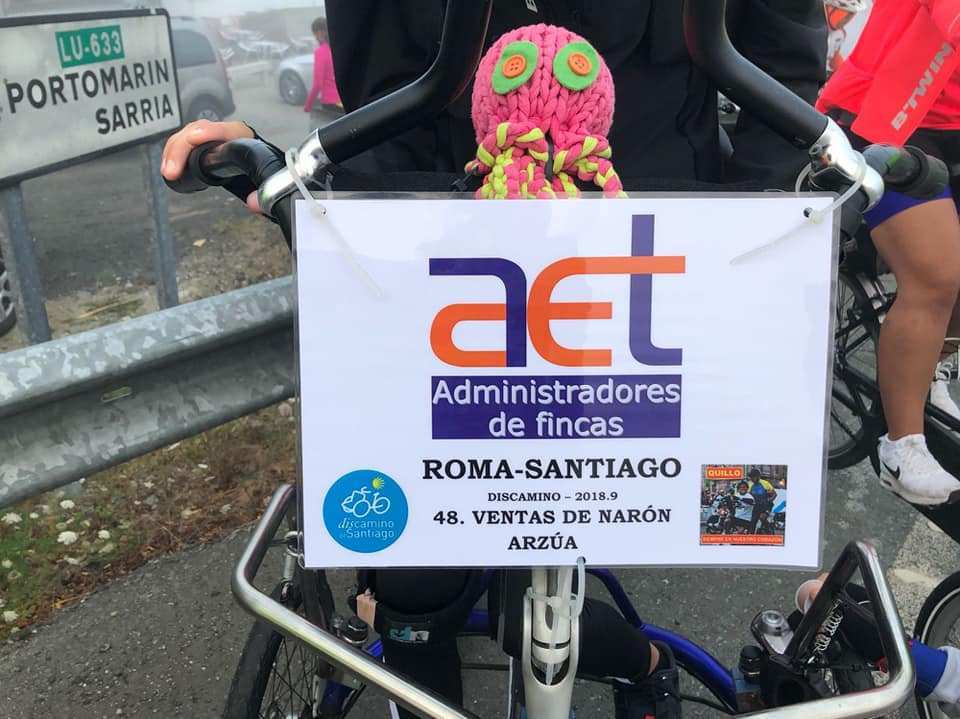Mañana falta rematar la faena con los 38 kilómetros que hay de Arzúa a Santiago. En esta última etapa nos van a acompañar casi todos los que han participado en este Camino, los que nos han hecho compañía y han conseguido que todo fuera fácil y agradable, que no estuviéramos ni nos sintiéramos solos, los que nos han ayudado en los momentos difíciles y con los que nos hemos reído en tantas ocasiones: José María, Fernando, Paula, José Luis, Silvia, Estrella, Jesús, Lino, Gerardo Fernández, David Gil, Xoana, Juanda, Daniel, Ana, Calis, Borja, Carla, Germán, Olalla, Xabela, Nuria, Álex, Emi, Jairo, María, Xoana y Koko; y echaremos de menos enormemente a Antonia, Faty, Luluxa y Ramón. Entraremos en la plaza con 8 Triciclos-tándem de doble pedaleo, 2 Bici-Silla de ruedas, 1 Handbike y Borja con su bici. Vendrán pilotos de los nuestros a hacer lo que siempre hacen, facilitar la felicidad de los otros siendo felices ellos mismos: Chema, Adrián, Fer, Iván, Jorge, Martín, Mauro y Miguel. Va a ser una verdadera fiesta en la que disfrutaremos de la compañía de otros amigos que vendrán una vez más a apoyarnos: Alfonso, Fani, Javier… (espero no haberme dejado a nadie en el tintero, pero, de ser así, confío en que me lo perdonéis).