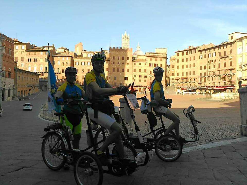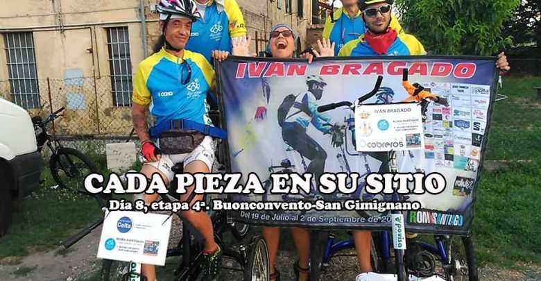 El día ocho del Roma-Santiago, cuarta etapa de regreso de Discamino que ha sido algo más tranquila y más cuando los problemas se solucionaron en el triciclo de Iván, de Chema hasta encontrar la solución. Los cincuenta kilómetros de la etapa de ayer domingo Buonconveto-San Gimignano dieron para muchas cosas pero el relax después de tanto estrés buscando la pieza que permitiera llevar a Iván y Chema a la normalidad quedaba atrás, hasta Javier Pitillas se le notaba en sus comentarios mucho más tranquilo.
