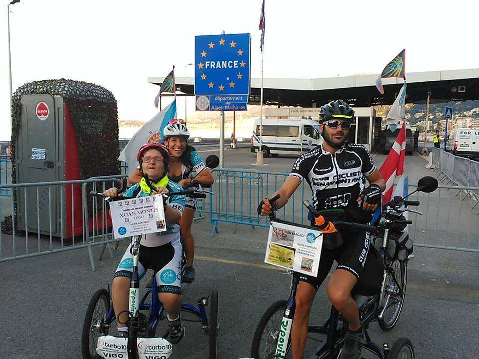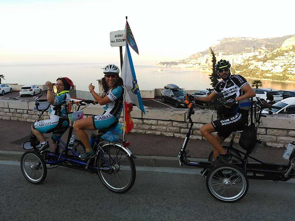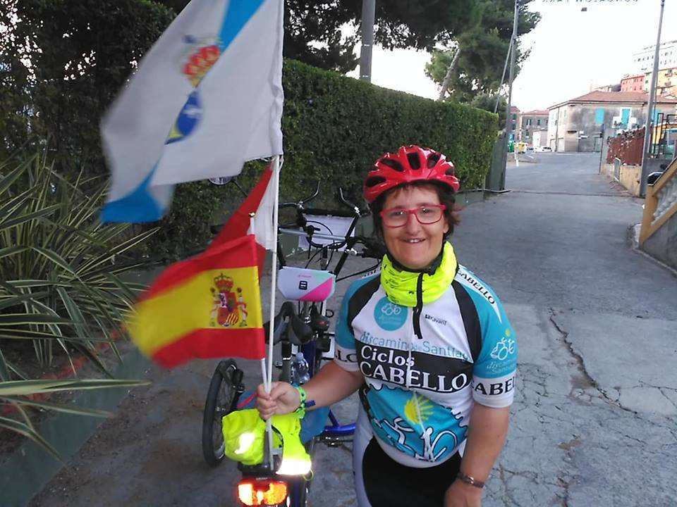 Primera jornada de pedaleo de Paula. En su triciclo llevaba las banderas de Vigo, Galicia y España.