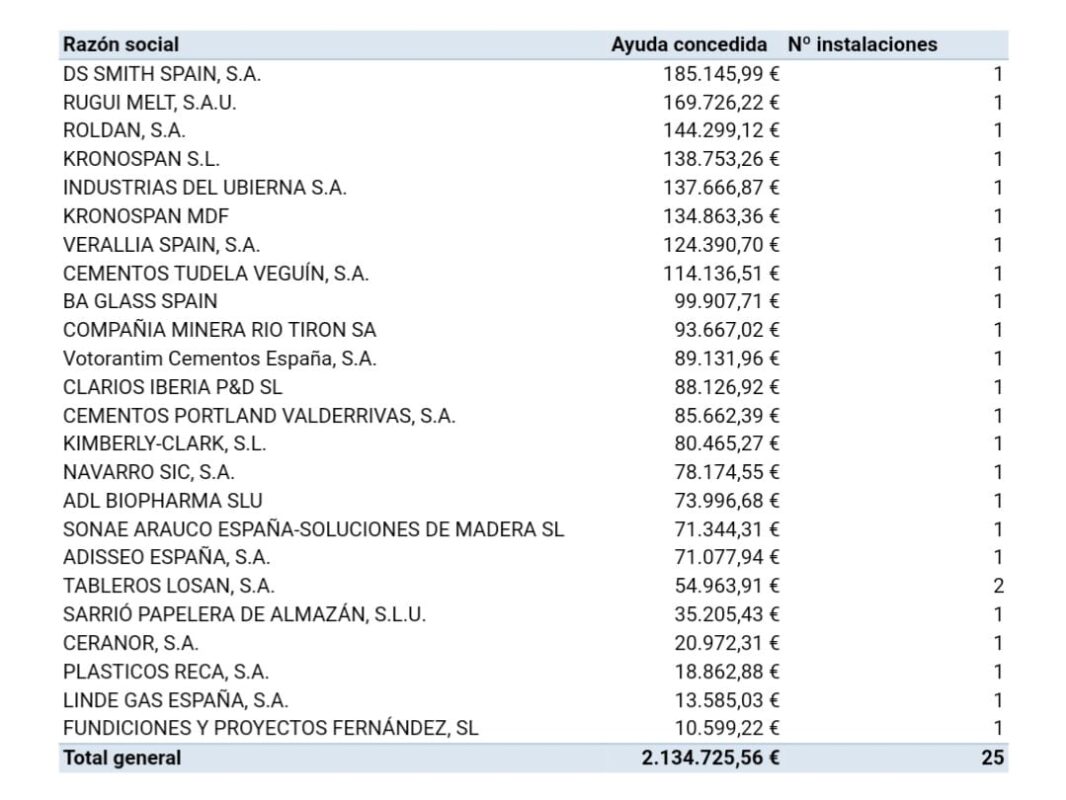Entre las empresas más beneficiadas destacan Repsol con 1,7 M€, CEPSA con 1,5 M€, ArcelorMittal con 1,3 M€, Ercros con 1,2 M€, Dow Chemical Ibérica con 1 M€, y Asturiana de Zinc con 872.454 euros.