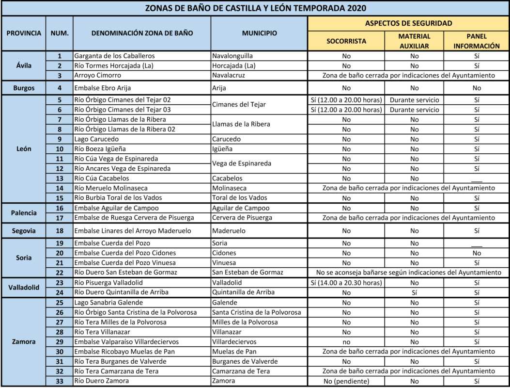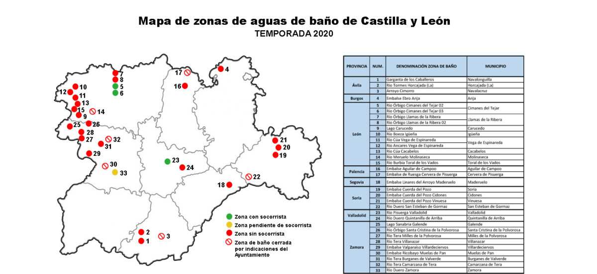 Según los datos proporcionados por los ayuntamientos, solo tres de las 33 zonas acuáticas naturales aptas para el baño, publicadas por la Consejería de Sanidad de la Junta de Castilla y León, cuentan actualmente con servicio de socorrismo y seis espacios tienen cerrado el acceso al baño o aconsejan no bañarse en él.