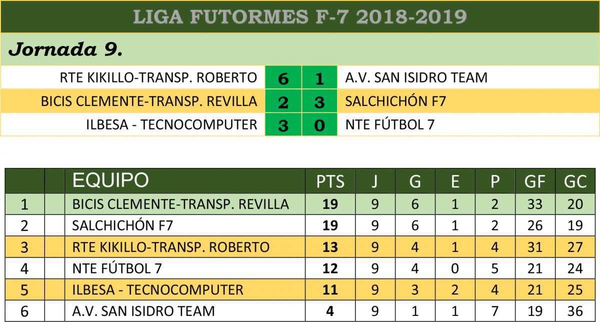En la Liga de Fútbol 7 también organizada por Futormes, tras la disputa de la jornada del pasado lunes, se pone interesante en los puestos altos de la misma. Salchichón ha logrado dar caza a los líderes, Bicis Clemente-Transportes Revilla al que ganaba igualando la cabeza a 19 puntos. Este resultado permite además a los perseguidores acortar diferencias y afrontar el campeonato con otro interés.