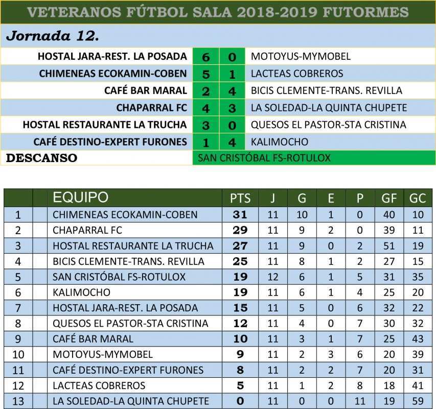 Otra jornada más sin cambios en la Liga de Veteranos de Fútbol Sala organizada por Futormes y donde los primeros equipos siguen sin perder. Emoción sin límites en el encuentro que enfrentó al Chaparral y a la Soledad-La Quinta del Chupete con mucho suspense y que finalizaba con un apurado 4-3 en favor de los primeros. Algo menos de apuros pasaron los líderes Chimeneas Ecokamín-Coben Cerámicas y Restaurante La Trucha que vencieron sin problemas a sus rivales.