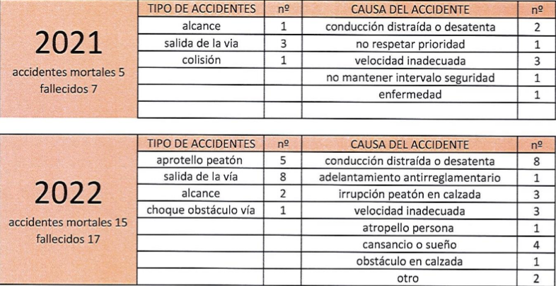 De los 17 fallecidos en 2022, 8 se sitúan en la franja de edad comprendida entre los 26 y los 60 años, 7 entre los mayores de 60 y dos entre los 0 y los 26 años. 11 de los accidente siniestrados se produjeron en carreteras nacionales, 3 en autonómicas y 1 en la red provincial.