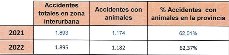 Aunque comparando los datos del 2021 con los de 2022 las cifras varían levemente, el porcentaje de accidentes ocasionados por invasión de animales en las vías sigue siendo muy elevado: más del 62%. Para el subdelegado Angel Blanco “sigue siendo urgente buscar una solución ante este problema”.