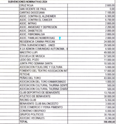 El Ayuntamiento de Benavente destina en el presente ejercicio del 2024 un total de 530.000 euros en subvenciones a los diferentes colectivos y asociaciones de la ciudad. En los presupuestos del 2024 por importe de casi 23 millones de euros, como se publicó ayer en Benavente Digital tras la rueda de prensa ofrecida por la alcaldesa, Beatriz Asensio y el concejal de Hacienda, José Manuel Salvador, se detallan en subvenciones nominativas, 398.490 euros, así como subvenciones en concurrencia competitiva, 128.200 euros. Así se refleja en las tablas adjuntas: