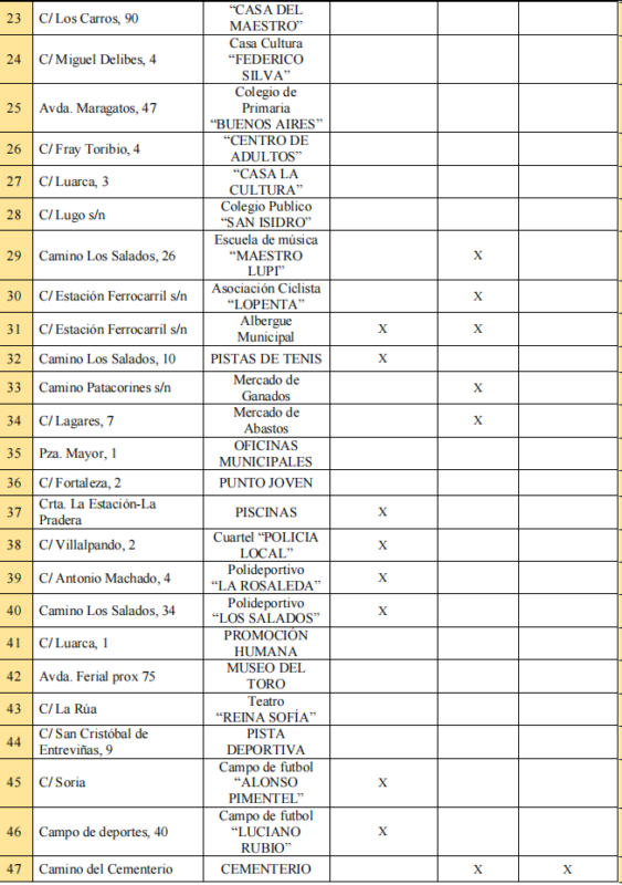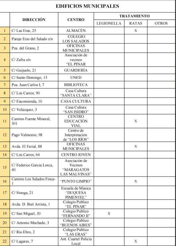 Los edificios en los que se actuará contra las ratas afectan a las oficinas del Ayuntamiento en el edificio de El Ferial, el Centro de Educación Vial, el Cuartel de Policía Local, el Mercado de Abastos, el Mercado de Ganados, el Albergue Municipal, las instalaciones cedidas a la Banda de Música Maestro Lupi en Camino los Salados y a la Asociación Lopenta en la Calle Estación Ferrocarril, el Cementerio, el Punto Limpio y un almacén propiedad del Ayuntamiento ubicado en la calle Las Eras.