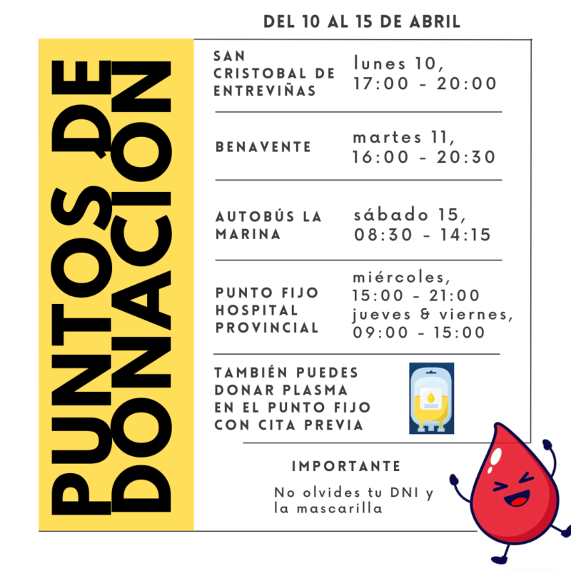 Este martes 11 de abril, a partir de las 16:00 horas y hasta las 20:30 horas, un equipo móvil del Centro de Hemoterapia se traslada hasta el Centro de Salud Benavente Sur para las donaciones de sangre.