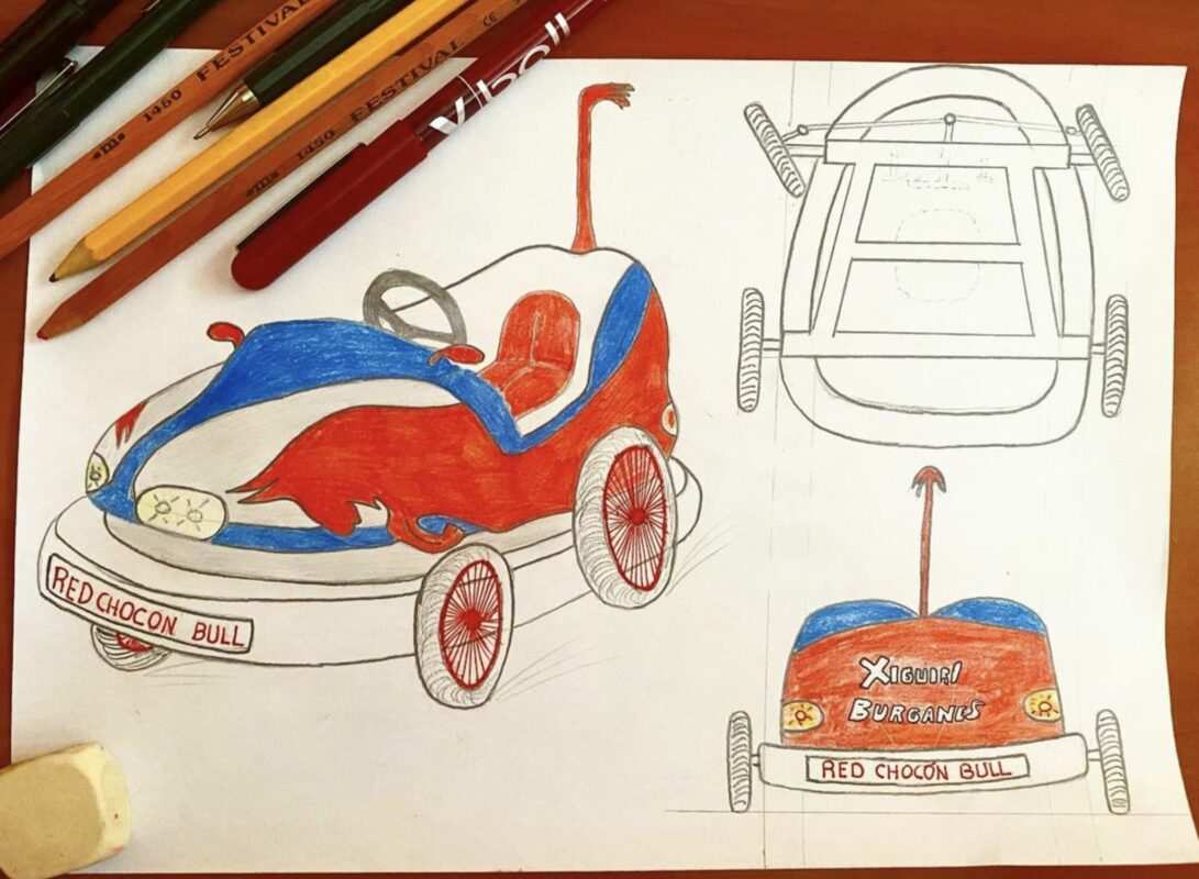 El Burganes Xiguiri Team no deja ni un solo día de trabajar en su auto loco que lo han denominado «Red Chocón Bull», en alusión a esta prueba. Con este diseño, realizado al estilo tradicional con lápiz, bolígrafo y pinturas de colores, han sido seleccionados entre más de 1000 solicitudes para ser uno de los 45 equipos participantes en la carrera sin motor más loca del año.