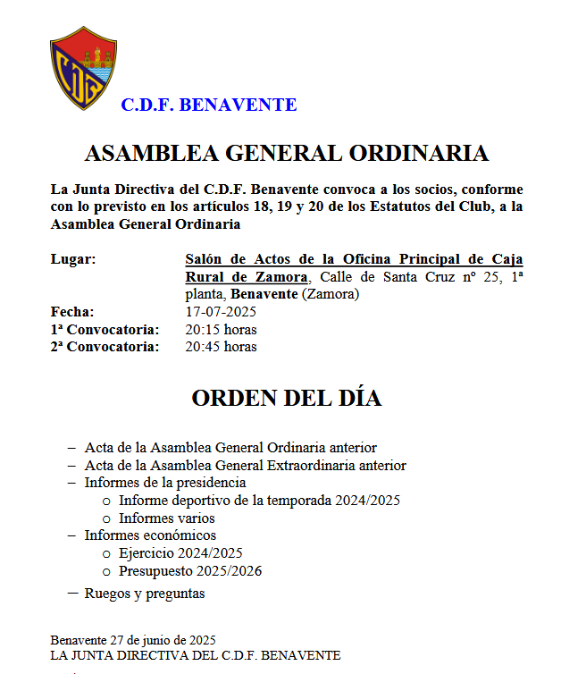 La Junta Directiva del Club Deportivo Fútbol Benavente ha anunciado la convocatoria oficial de su Asamblea General Ordinaria, que tendrá lugar este jueves 17 de julio de 2025, en el Salón de Actos de la Oficina Principal de Caja Rural de Zamora (Calle de Santa Cruz nº 25, 1ª planta, Benavente).