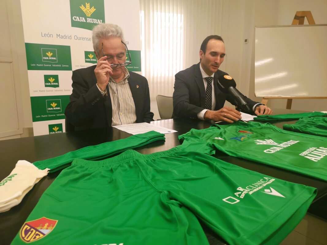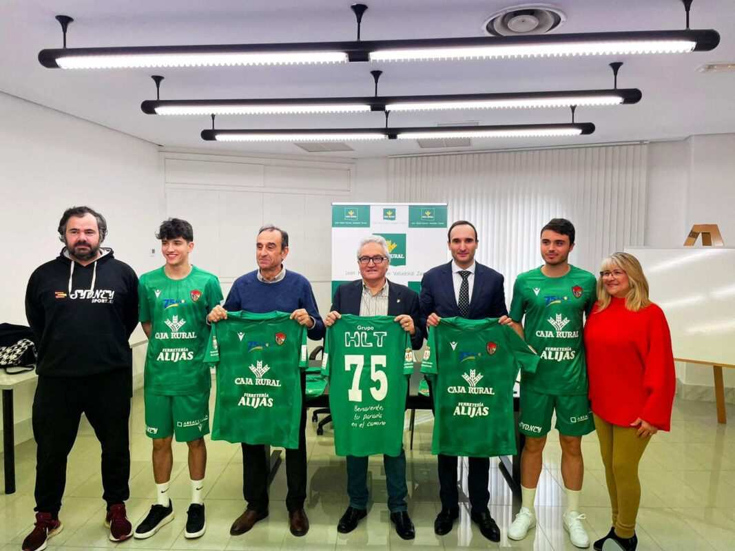 Con nuevo diseño y de color verde, en un guiño al cromatismo de Caja Rural y el compromiso con el mundo rural, el CD Benavente presentaba esta mañana la segunda equipación que será estrenada este próximo domingo 5 de febrero contra el Fabero. Junto al presidente del CD Benavente, Pedro Ángel Gallego, el director de Zona de Caja Rural, Primitivo Santos, quiso mostrar el agradecimiento y el compromiso de la entidad con el CD Benavente, no sin antes desear que la nueva camiseta aporte éxitos al club que celebra sus bodas de platino.
