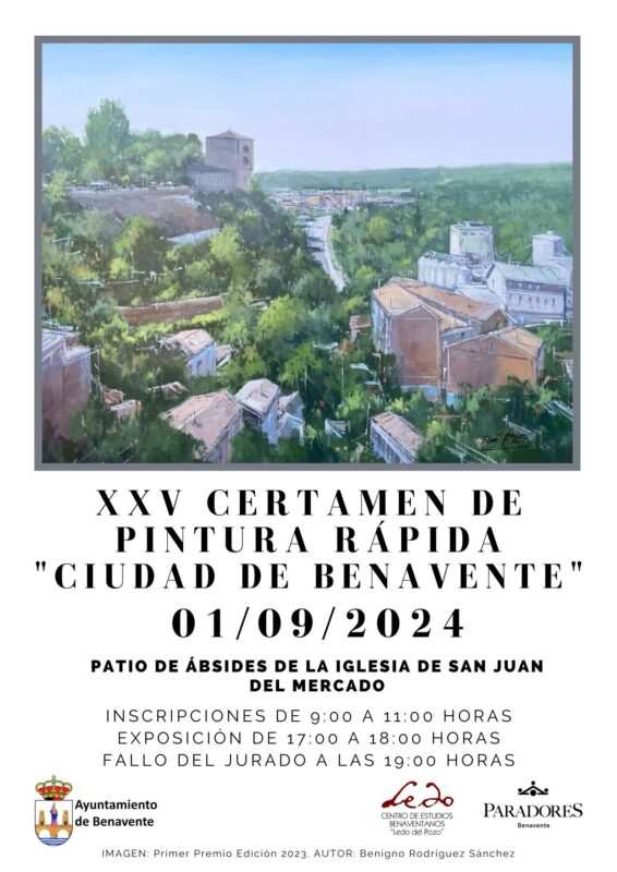 La Concejalía de Cultura de Benavente organiza el domingo 1 de septiembre la XXV edición del Certamen de Pintura Rápida ‘Ciudad de Benavente’. Un certamen que cumple sus bodas de plata modificando la fecha de su desarrollo que coincidirá con las Ferias y Fiestas de Septiembre.