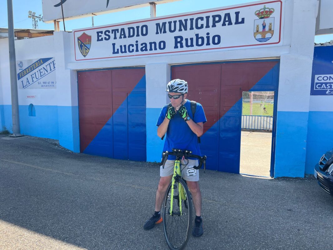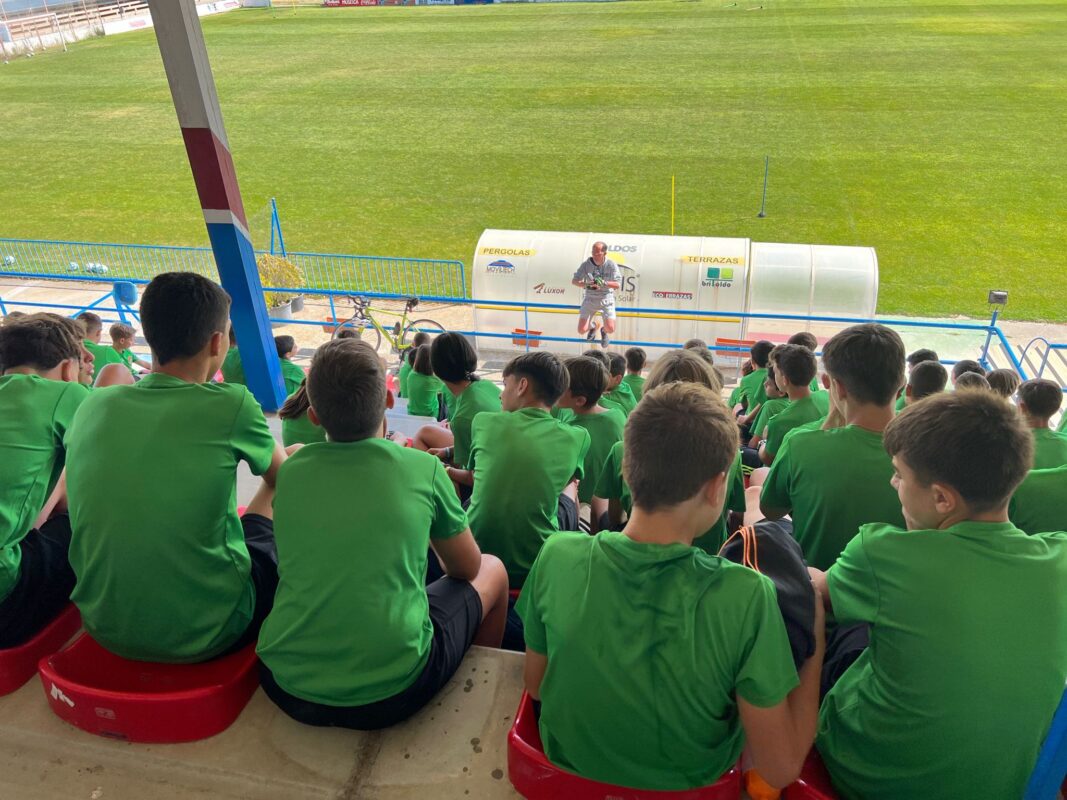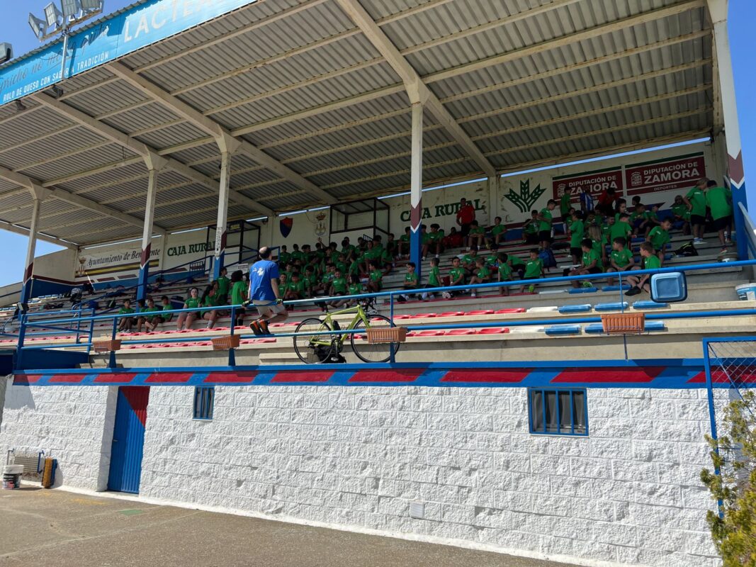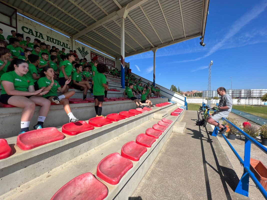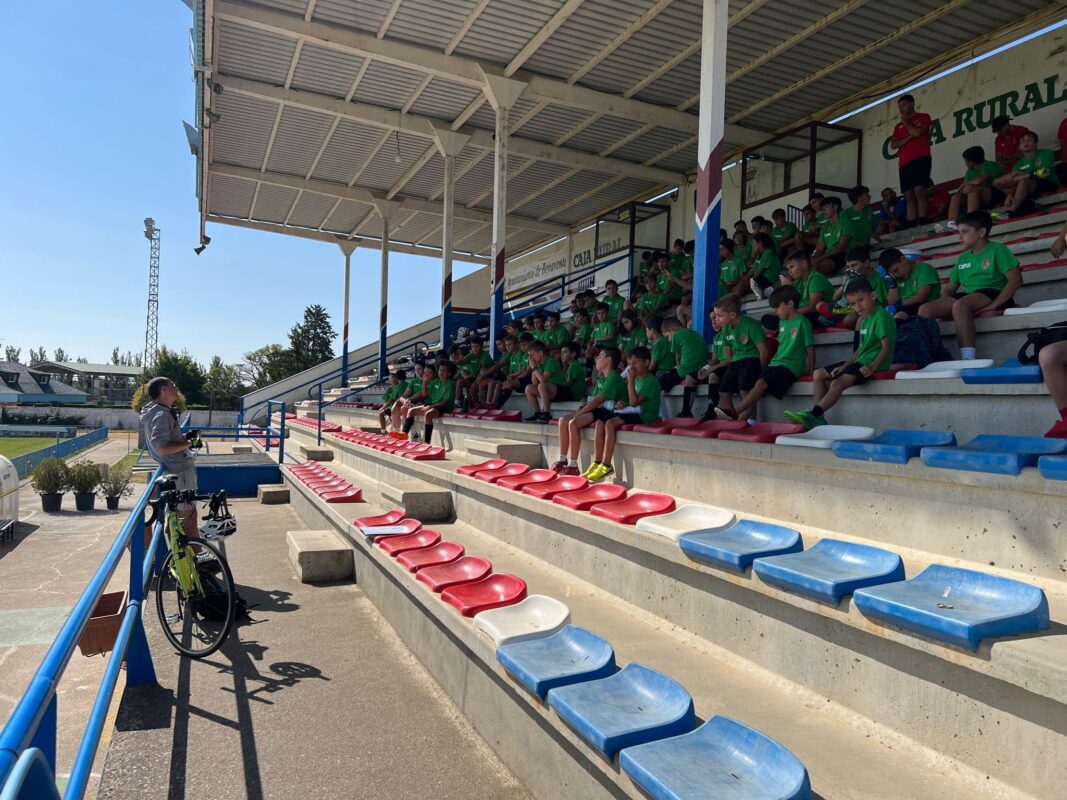 Los participantes en el campus de fútbol de verano del CD Benavente que se viene desarrollando en el estadio Luciano Rubio recibieron esta mañana la visita del ciclista José Luis Posado Brines, un avezado deportista vallisoletano, aunque residiendo en Zamora, y que en su trayectoria anima a los niños y jóvenes a practicar deporte saludable. José Luis Posado realizaba esta mañana el recorrido en bici de 77 kilómetros, en 5 horas, con salida a las 05:00 horas desde Zamora hasta el estadio de fútbol Luciano Rubio de Benavente donde era recibido a las 10:05 horas con calurosos aplausos por los participantes en el campus de fútbol.