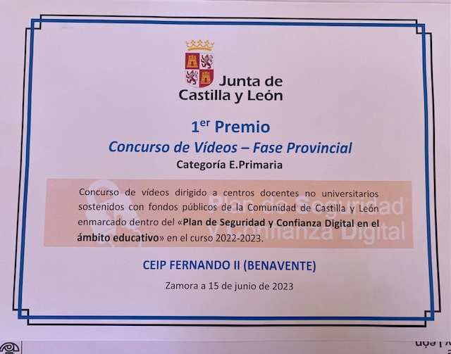 Ayer el colegio de infantil y primaria Fernando II de Benavente recibió el Primer Premio del Concurso de Vídeos – Fase provincial. Categoría E. Primaria. El tema tratado en el vídeo es el ciberacoso y está enmarcado dentro del Plan de Seguridad y Confianza Digital en el ámbito educativo.
