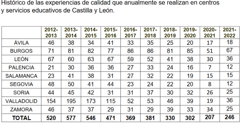 Los centros y servicios educativos de Castilla y León trabajaron el pasado curso de forma muy activa en la elaboración de un total de 246 experiencias de calidad, demostrándose así la inquietud de mejora de los centros de Castilla y León y su búsqueda de la excelencia.