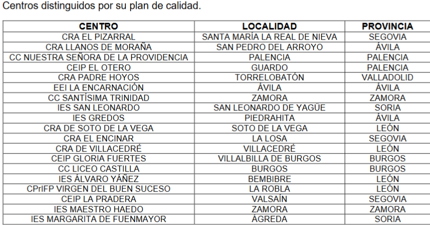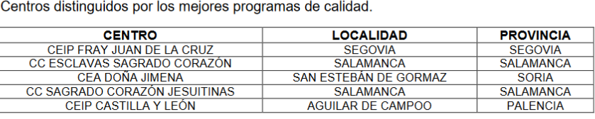 De los centros premiados, cada provincia de Castilla y León cuenta con cinco centros o servicios educativos galardonados. Además, 26 de ellos pertenecen al ámbito urbano y 19 a la zona rural. En cuanto a la distribución de experiencias atendiendo a la etapa educativa, 25 trabajos pertenecen a colegios de Infantil y Primaria y Educación Especial, 10 centros son institutos de Secundaria, servicios educativos y centros de Enseñanzas de Régimen Especial y 10 son experiencias de centros concertados.