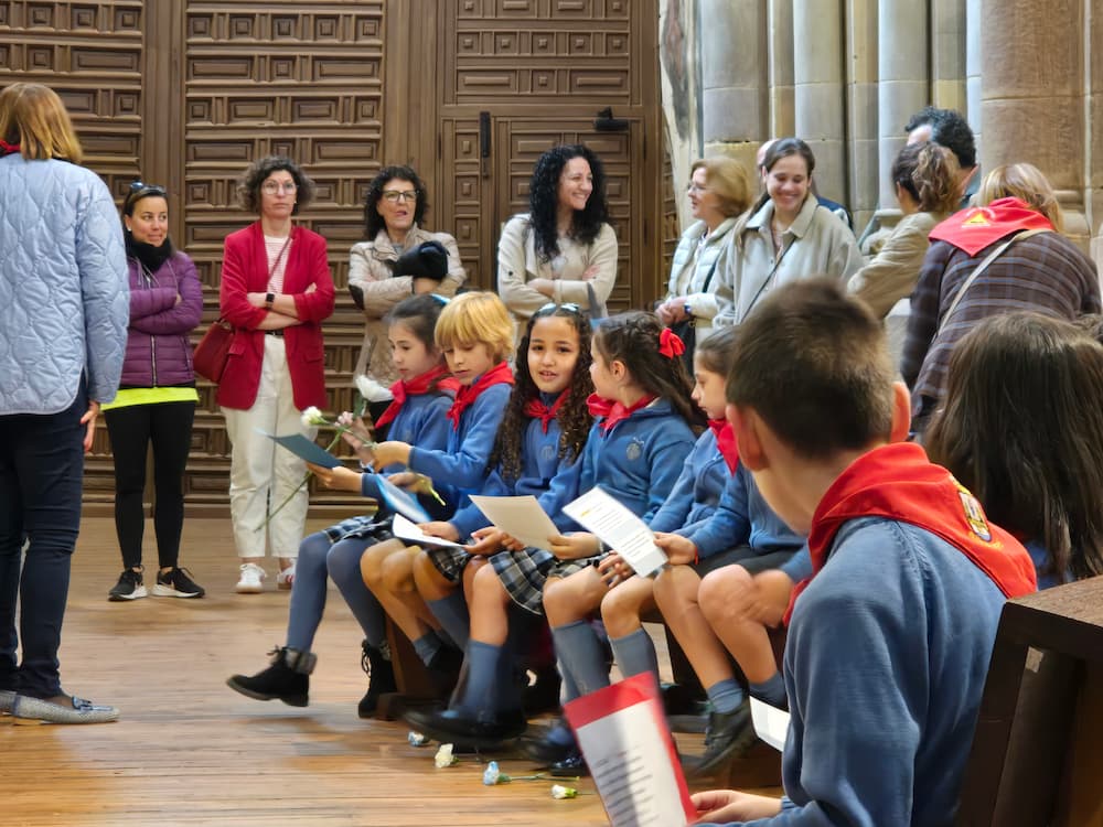 Ya en el interior del templo, los alumnos depositaron sus claveles a los pies de la patrona en una ofrenda sencilla y sincera. Como es costumbre en el centro, el acto estuvo acompañado de cánticos y momentos de recogimiento que crearon una atmósfera de respeto y emoción. El momento más conmovedor llegó con la interpretación del himno a nuestra patrona, que los escolares cantaron con devoción, cerrando así el acto entre aplausos sentidos y gritos de «Viva Benavente».