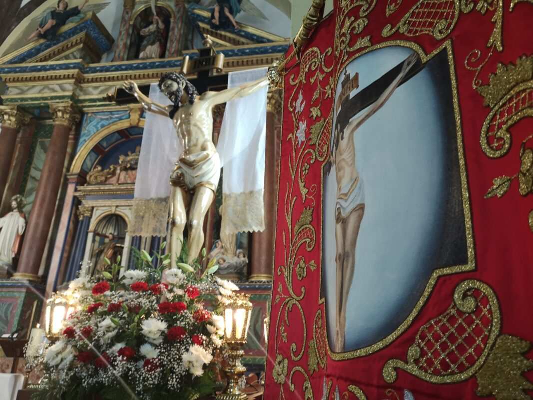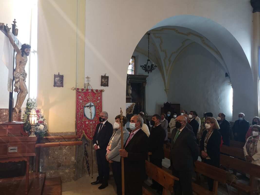 La bella imagen del Bendito Cristo de la Vera Cruz, instalada junto al altar mayor, lucía sus mejores galas con el sudario de encaje y elegante ornamentación floral, recogiendo las miradas de los devotos en este día de fiesta.