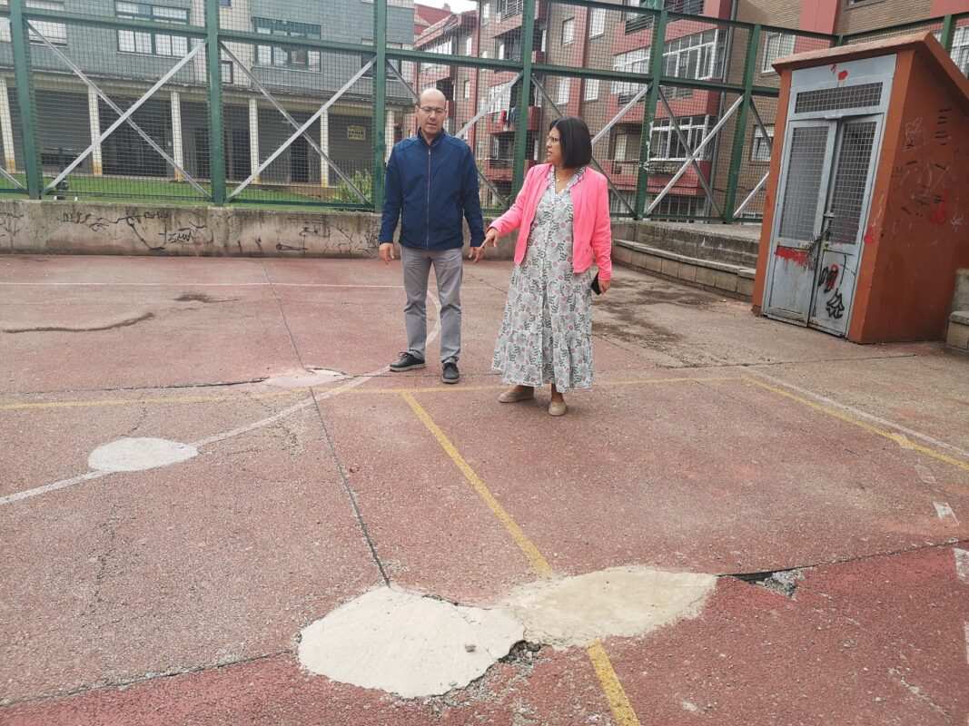 Los concejales del PP, Asensio y Salvador, muestran el deteriorado estado de la pista deportiva