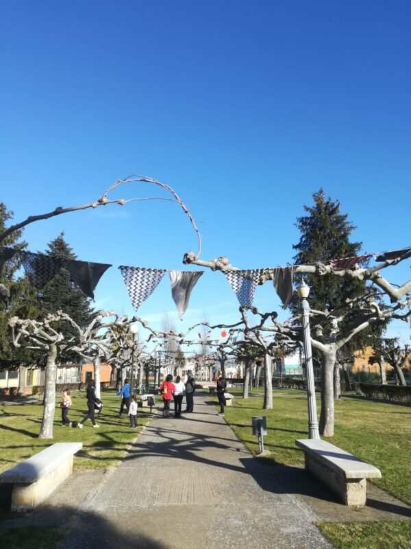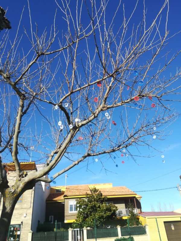 A base de materiales de reciclaje, con variado cromatismo se han decorado los árboles de los paseos de esta céntrica zona verde de Santibáñez de Vidriales.