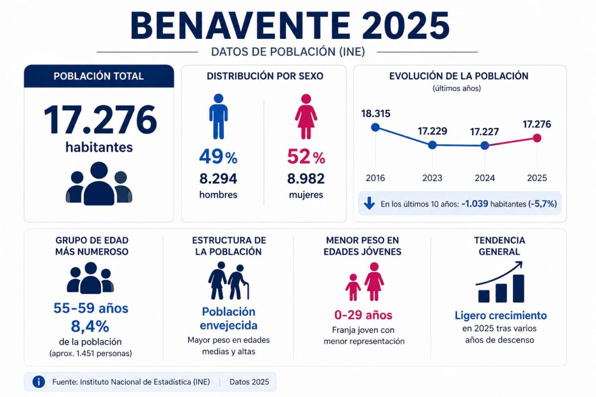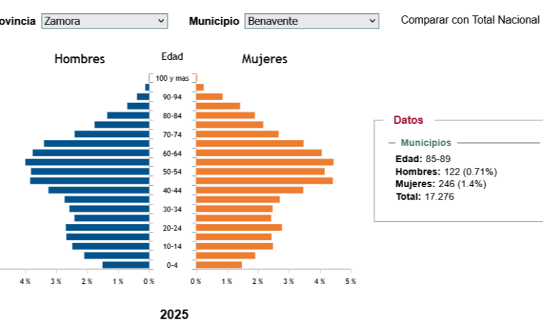 Los datos del INE de la población en Benavente de 2025 revelan que la ciudad cuenta con 17.276 habitantes según la pirámide de población oficial.