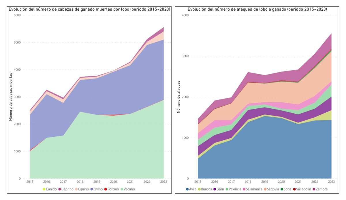 La Junta y las Organizaciones Profesionales Agrarias, en una reunión mantenida esta semana, han analizado los datos de ataques y número de cabezas muertas por daños de lobo en 2023, que alcanza, nuevamente, una cifra récord en Castilla y León con más de 5.500 cabezas de ganado muertas certificadas por ataques de lobo, un 9 % más que en 2022 y un 30 % más que en 2021. En el año 2021, el Ministerio para la Transición Ecológica y el reto demográfico incorporó el lobo al Listado de Especies Silvestres en Régimen de Protección Especial (LESPRE), lo que imposibilitó la caza de esta especie al norte del Duero y el control poblacional por daños a la ganadería en toda la comunidad autónoma, así como en el resto de España.