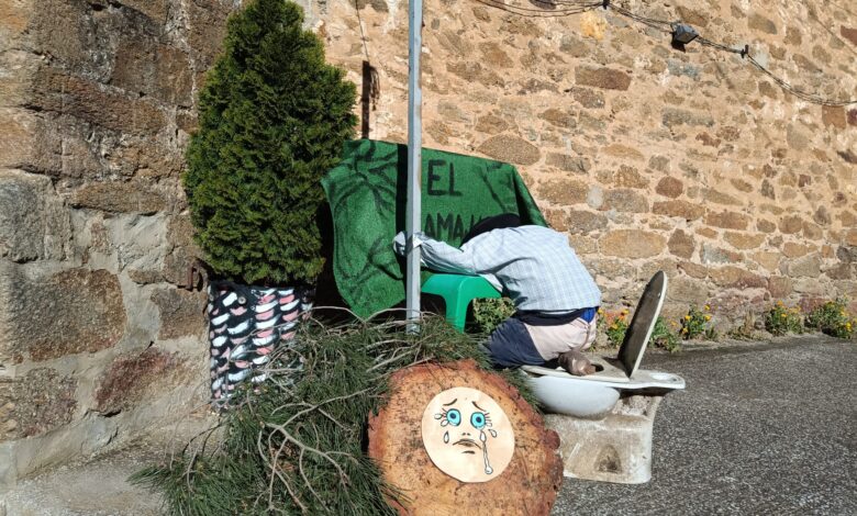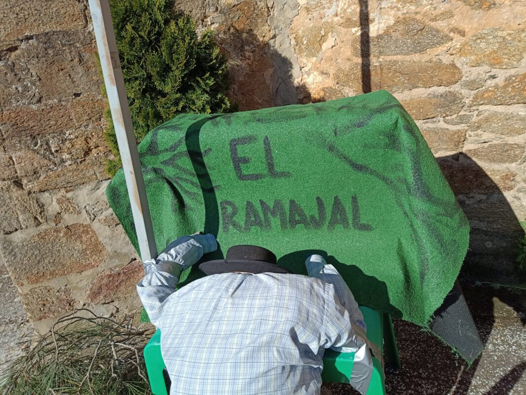 La representación de un vecino defecando en el Ramajal muestra con todo significado lo que viene denunciando buena parte del vecindario, la mierda a través de purines y demás que llegará hasta la planta de Junquera, en caso de prosperar el proyecto de la planta de biogás. Junto al señuelo del mayo aparece una pancarta con el lema del monte el Ramajal y troncos de pinos cortados recordando la reciente tala de varios de estos árboles del parque de La Milla de Tera que tenían muestras de procesionaria y el Ayuntamiento decidió talarlos, “sin valorar otras opciones”, como explicaron vecinos a este medio.