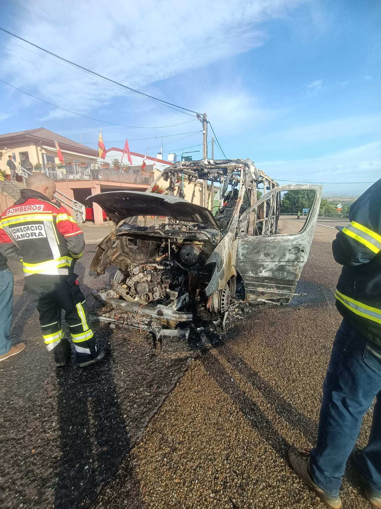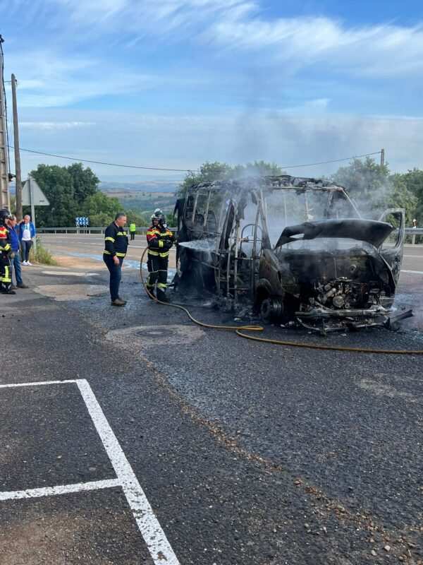Efectivos del Parque de Bomberos Tierras de Aliste con base en San Vitero del Consorcio Provincial de Bomberos de la Diputación de Zamora han intervenido hoy en las labores de extinción del incendio de un microbús a su paso por la localidad de Trabazos, sin que se hayan producido daños personales para ninguno de sus 15 ocupantes y el conductor del vehículo.