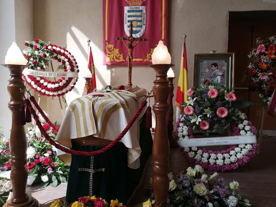 La villa de Villalpando decía esta tarde adiós a uno de los grandes de la tauromaquia, a su hijo predilecto Andrés Mazariegos Vázquez, al Maestro Andrés Vázquez. Desde este mediodía se instaló la capilla ardiente con sus restos mortales en el Salón de Plenos de la Casa Consistorial, en la que fuera antigua iglesia de los Templarios. El féretro bajo el escudo municipal con el lema: Rantia, Gloria, Extolle (levantar por causa de la gloria) vestía el capote de paseo del Maestro y rodeado de coronas de flores.