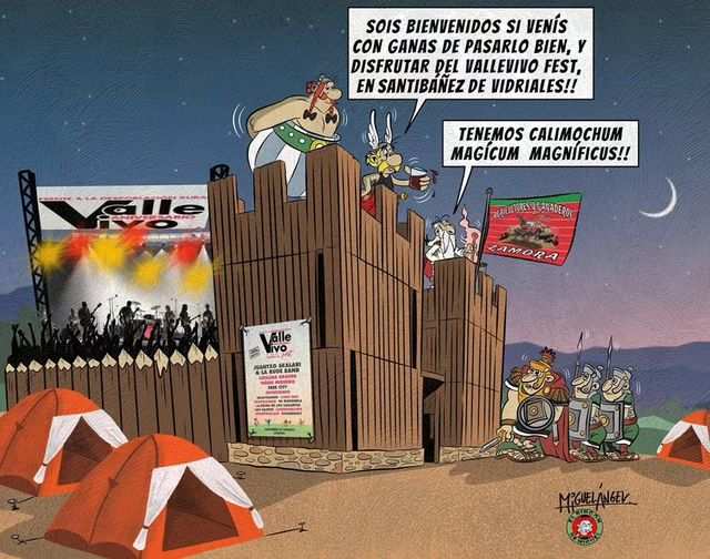 Los míticos personajes de la irreductible aldea gala, trasladados al recinto de los campamentos romanos de Petavonium, sirven, de la mano del afamado artista Miguel Ángel, para divulgar a los cuatro vientos el programa festivo que se prepara en el Valle Vivo Fest.