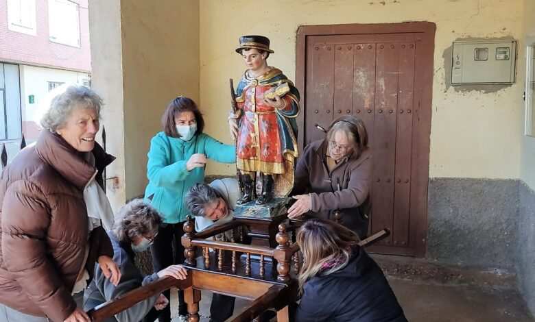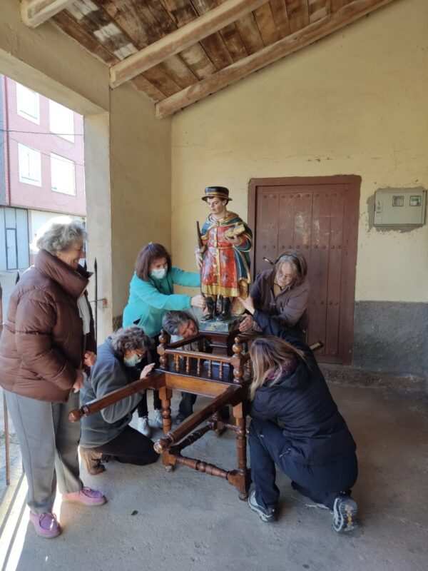 Con la cinta al sombrero del color rojo de los mártires y el púrpura del sacrificio, la imagen del copatrono de La Milla de Tera, de San Tirso, el Santo Tiso o «santutiso» como aquí se le denomina, ha sido profusamente engalanada esta tarde por un grupo de fieles devotas.
