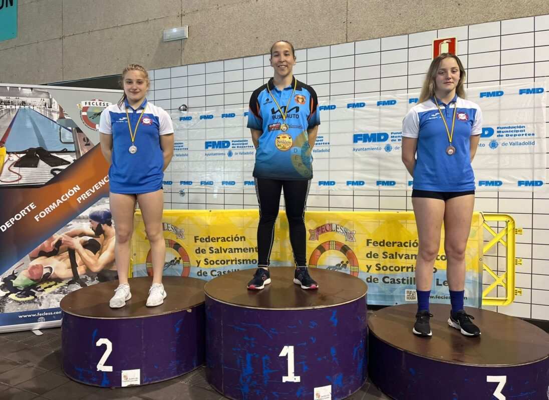 autonómicas las completaron Javier Huerga Sánchez (C.S.S. Benavente) en 100 metros combinada de salvamento absoluto (01:04:09), Sara Peña Merino (C.D. Unión Esgueva SOSVA) en 200 metros supersocorrista junior (02:36:98) y el equipo absoluto femenino del C.D. SOS La Bañeza en la prueba de 4×25 metros remolque de maniquí (01:28:63).