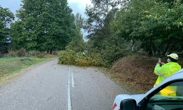 Operarios del Parque de Maquinaria de la Diputación de Zamora trabajan desde primeras horas de la mañana para despejar la calzada de la carretera ZA-V-2641 que comunica Trefacio de Sanabria con Pedrazales al caer un árbol.