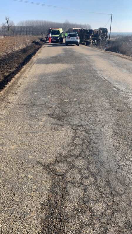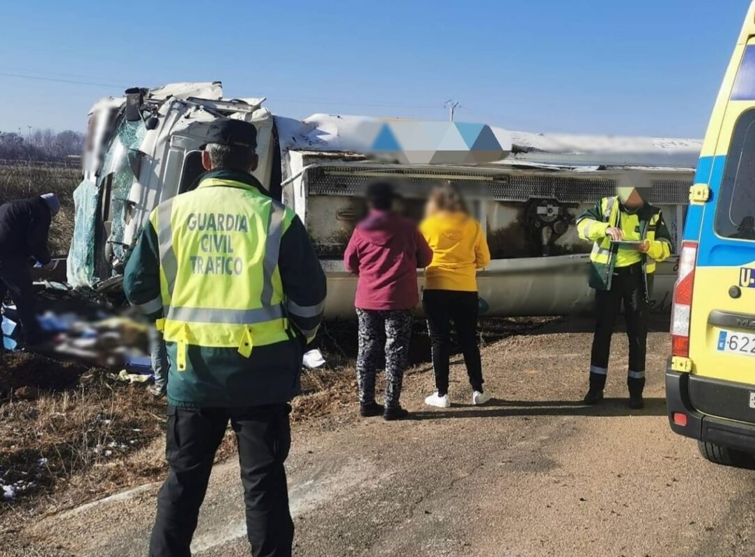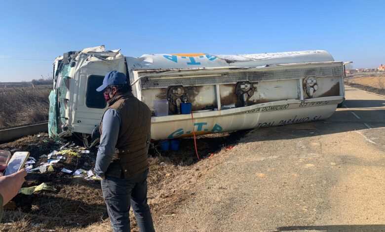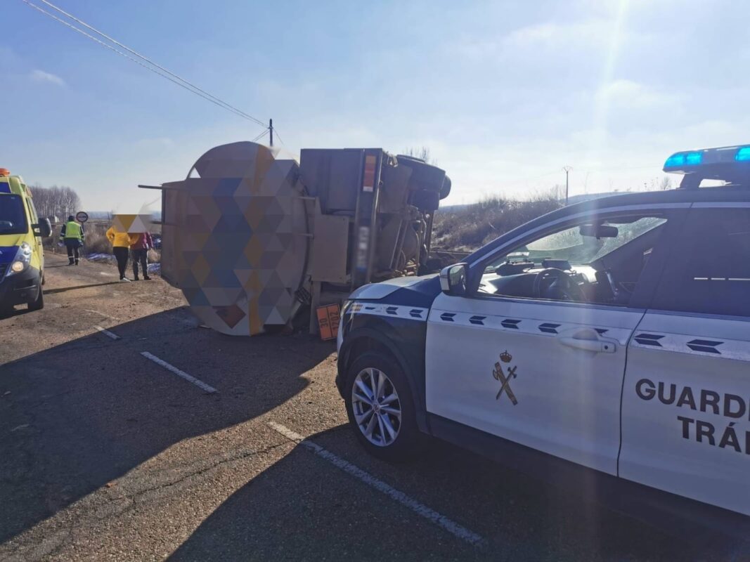 El camión se encuentra volcado sobre el arcén invadiendo parte de la calzada según han informado fuentes vecinales y la Guardia Civil que ha comunicado que el accidente se ha saldado con un herido leve.