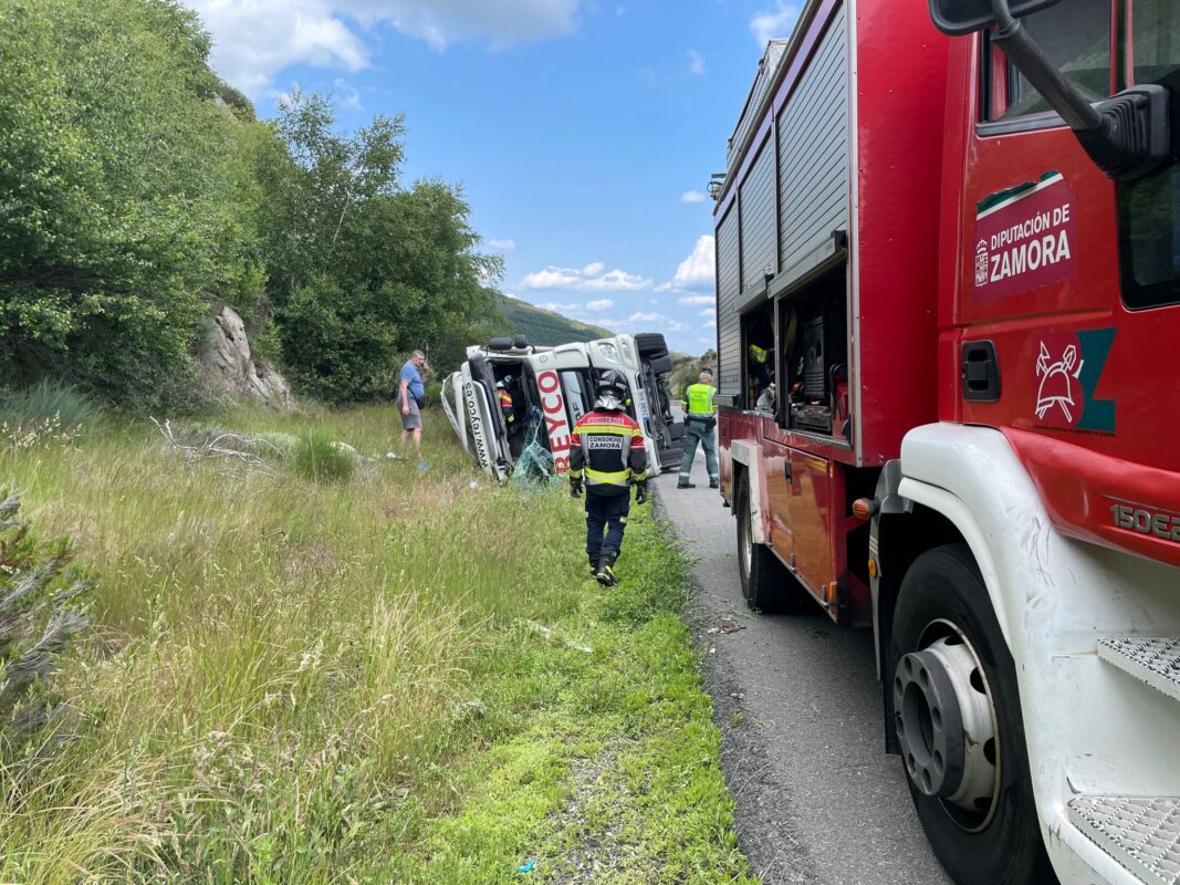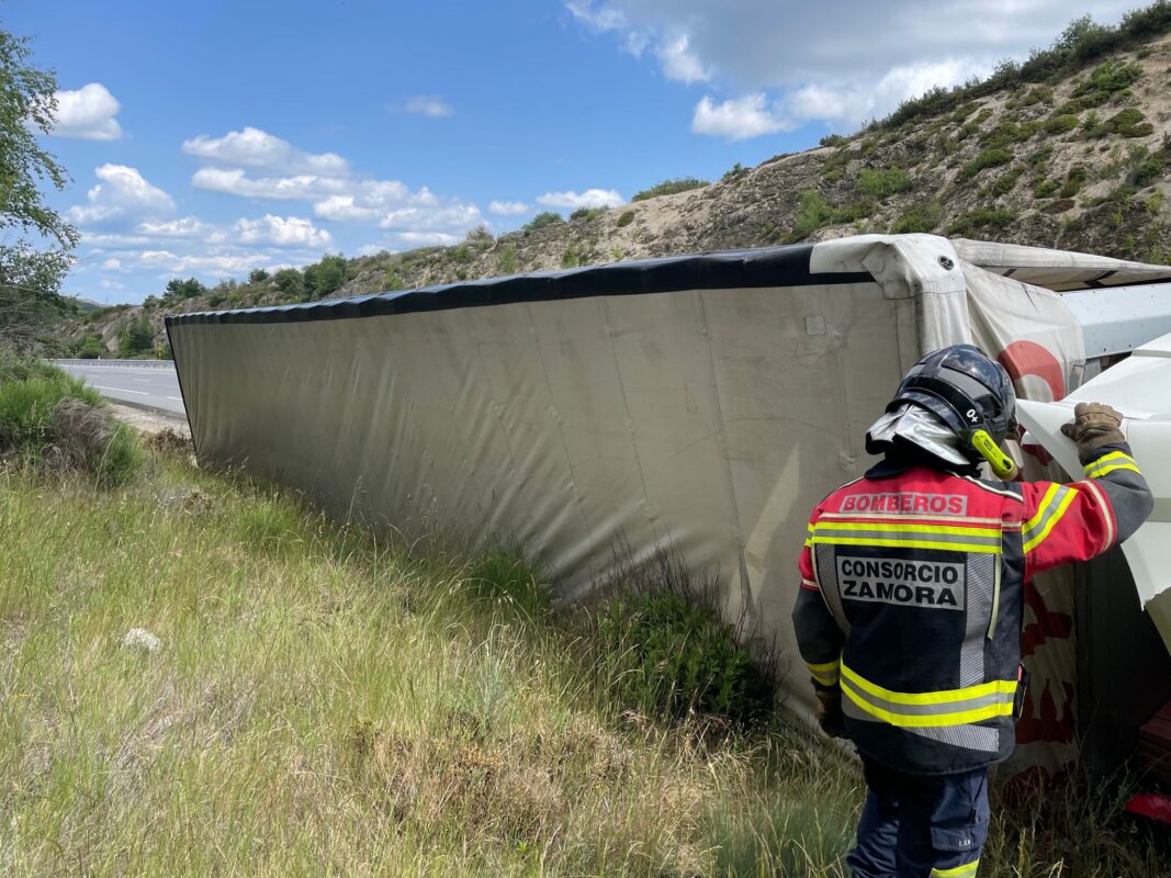 El Centro Coordinador de Emergencias del 112 de Castilla y León alertaba a las 15,40 horas al Consorcio Provincial de Bomberos con base en Rionegro del Puente de un accidente de tráfico ocurrido a la altura del km. 92 de la A-52 en sentido Orense, término municipal de Requejo de Sanabria, y donde un vehículo articulado había volcado en el margen derecho derramando el gasoil de sus depósitos.